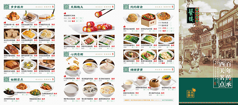 菜單價(jià)格避免使用常規(guī)排版版式,盡量弱化代替,將價(jià)格數(shù)字縮小,金錢標(biāo)志¥20簡化為20.價(jià)格后面標(biāo)明菜品的單位。價(jià)格代替,例如品深設(shè)計(jì)做的悅得閑、寶粵樓、蘩樓等廣式點(diǎn)心的菜單,都不放價(jià)格,用小點(diǎn)、大點(diǎn)、中點(diǎn)、特點(diǎn)、頂點(diǎn)、超點(diǎn)、精點(diǎn)、佳點(diǎn)、優(yōu)點(diǎn)來代替。在底部統(tǒng)一將小點(diǎn)、大點(diǎn)、中點(diǎn)、特點(diǎn)、頂點(diǎn)、超點(diǎn)、精點(diǎn)、佳點(diǎn)、優(yōu)點(diǎn)標(biāo)上價(jià)格。菜品與價(jià)格隔離就會(huì)減少價(jià)格對(duì)顧客的影響,不經(jīng)意間放大了顧客的消費(fèi)金額。